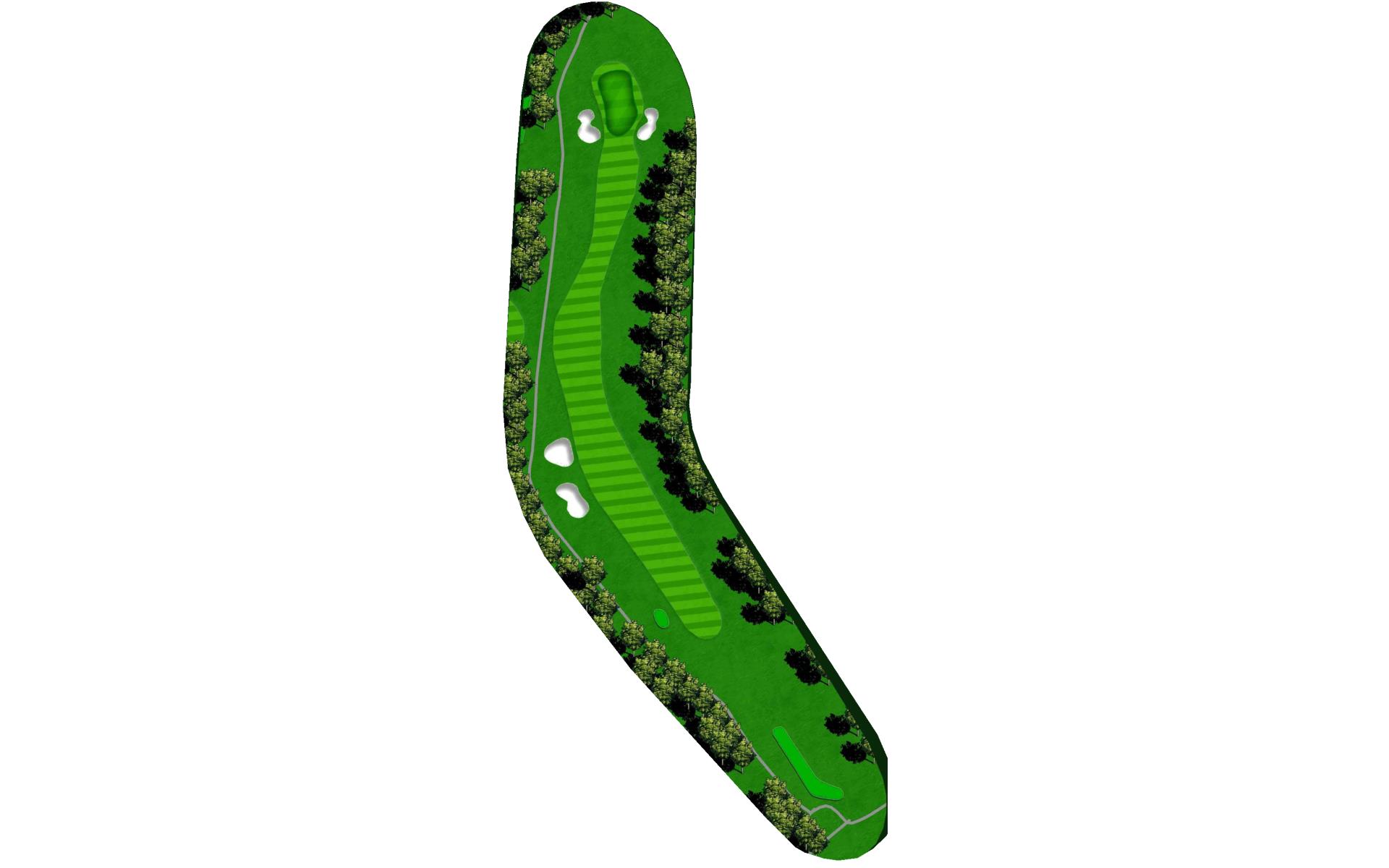 A par 4 with a slight dogleg right. The trees left of the fairway make hitting the green in regulation improbable. A green-side left bunker is one to avoid.