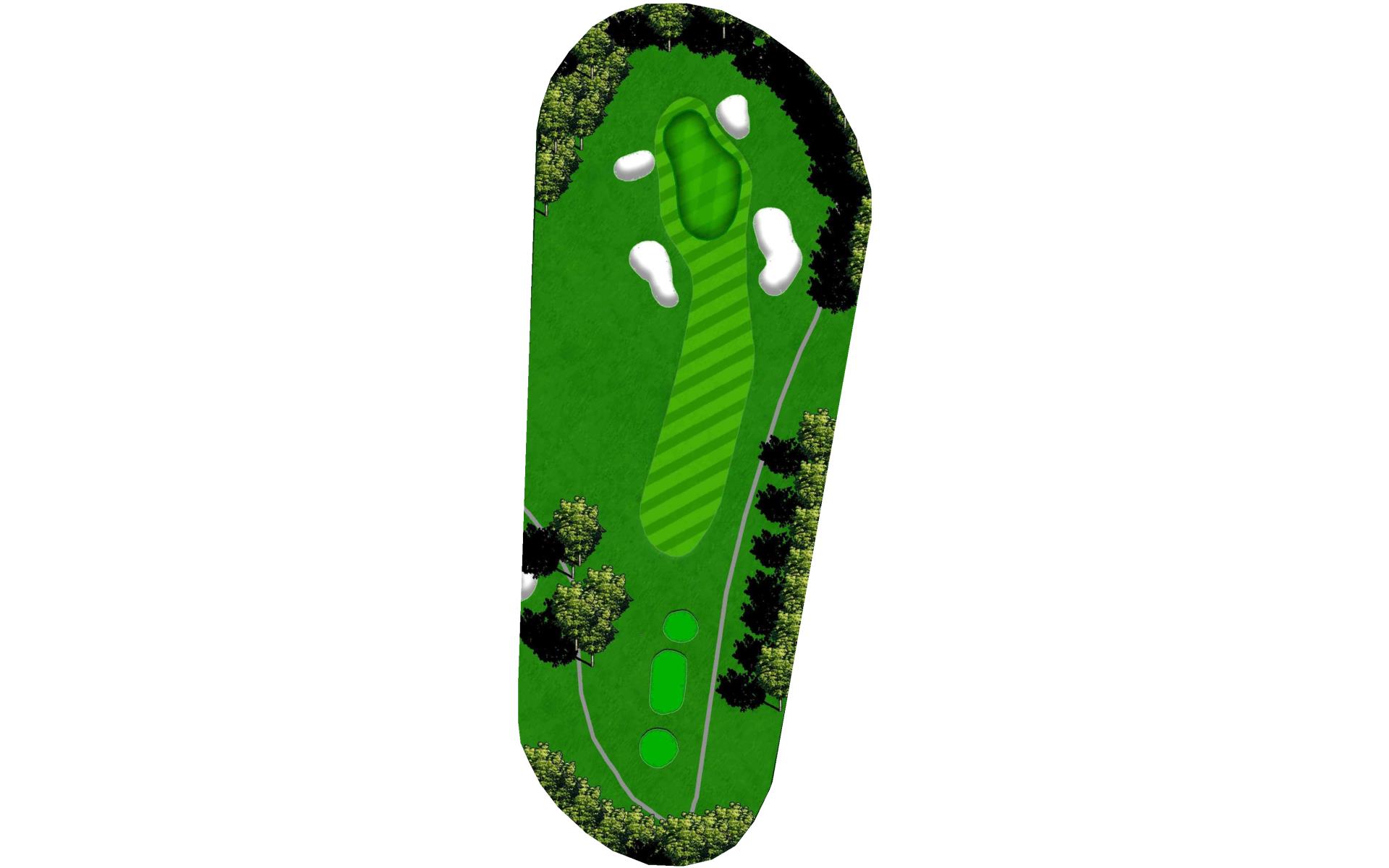 A short par 4 that requires an accurate tee shot of 180 to 200 yards. The approach shot is most critical, with a two-tier green and a pond short of the green.