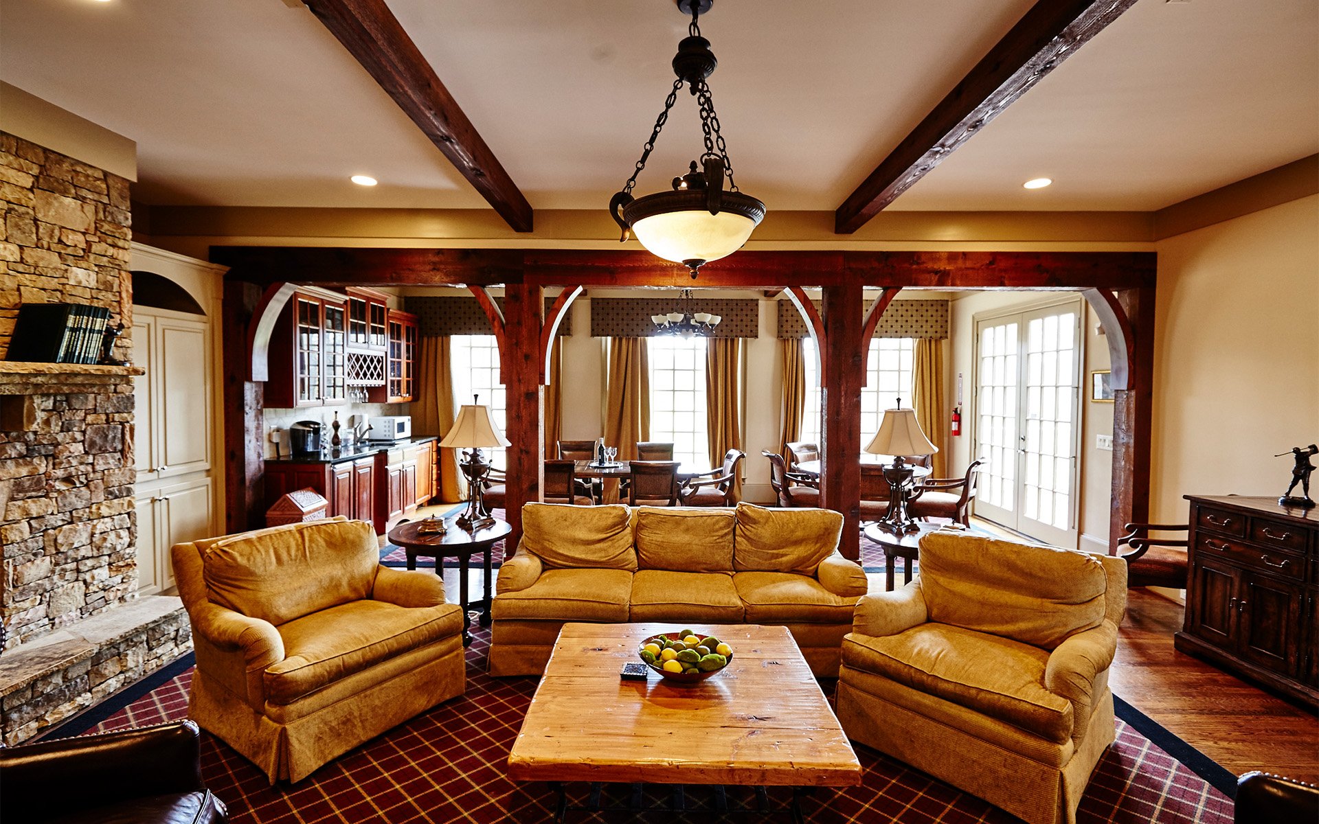 The Lodge is architecturally stunning and features the utmost in convenience and functionality for the most discerning golfer. The Lodge affords views of either the signature 12th hole, with its picturesque lake and rustic silos, or the challenging 8th hole, considered by many to be Atlanta National's toughest. With its wide and airy design, The Lodge is the perfect location for social functions or meetings. It features an outdoor deck and three bedrooms downstairs, as well as a bar area with microwave mini-refrigerator, living room, screened-in porch and one bedroom upstairs.