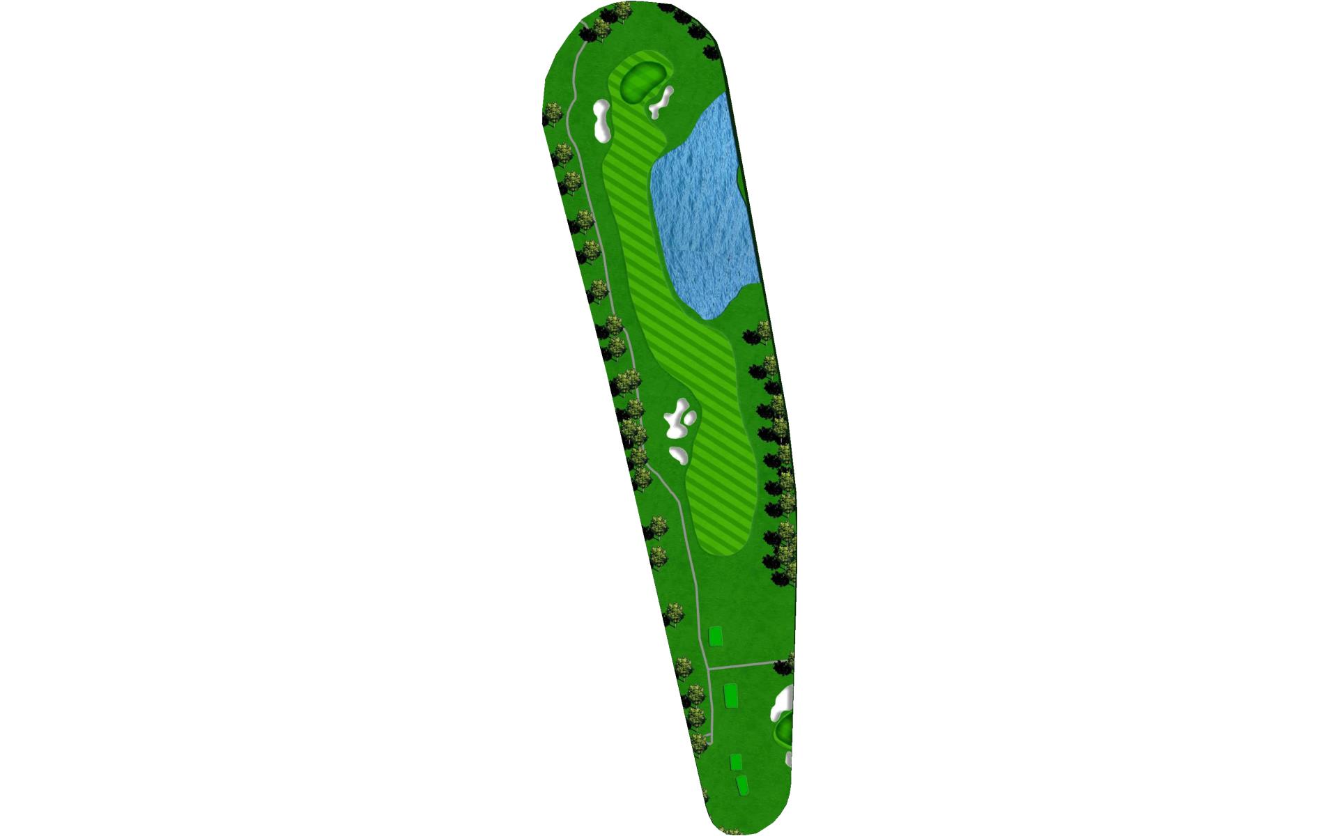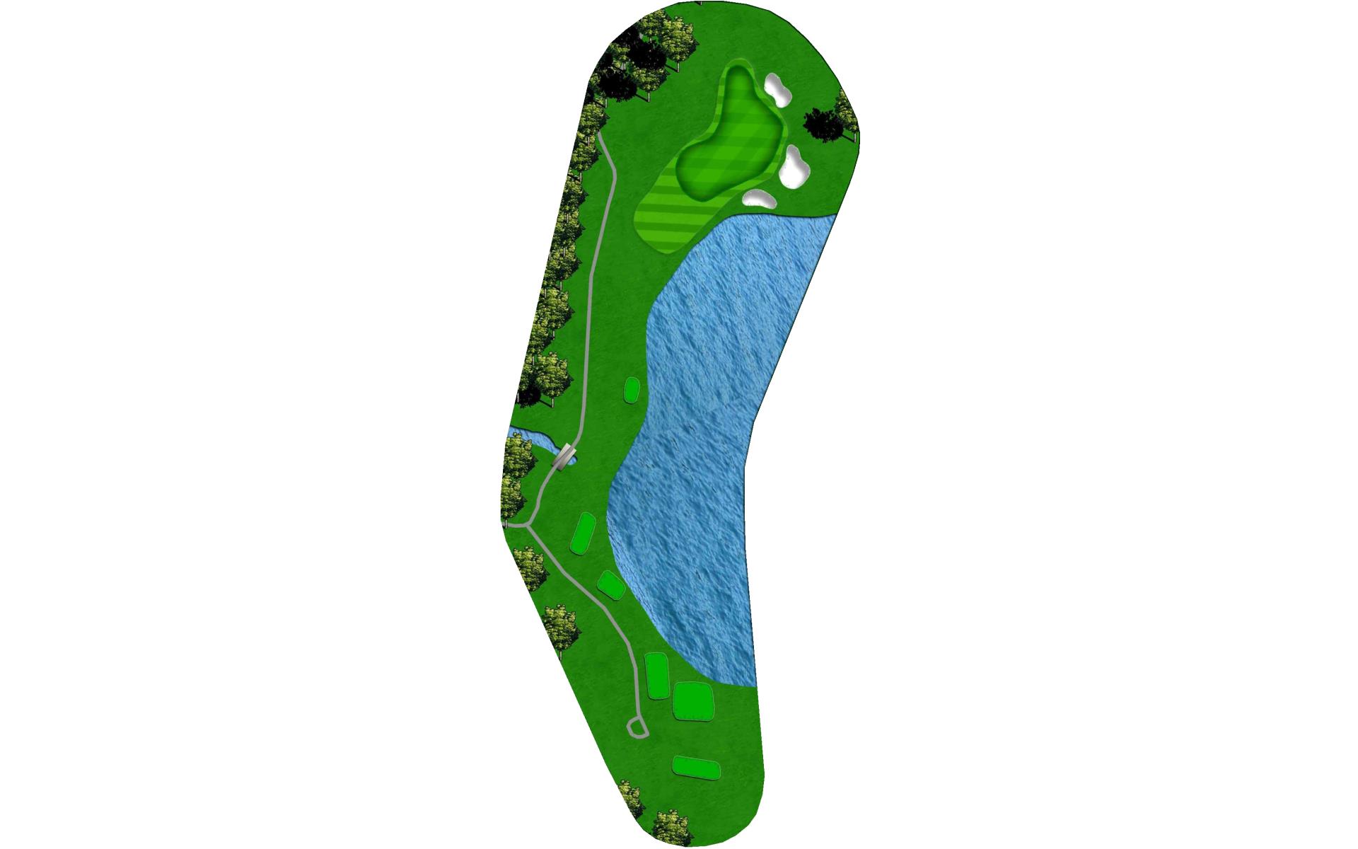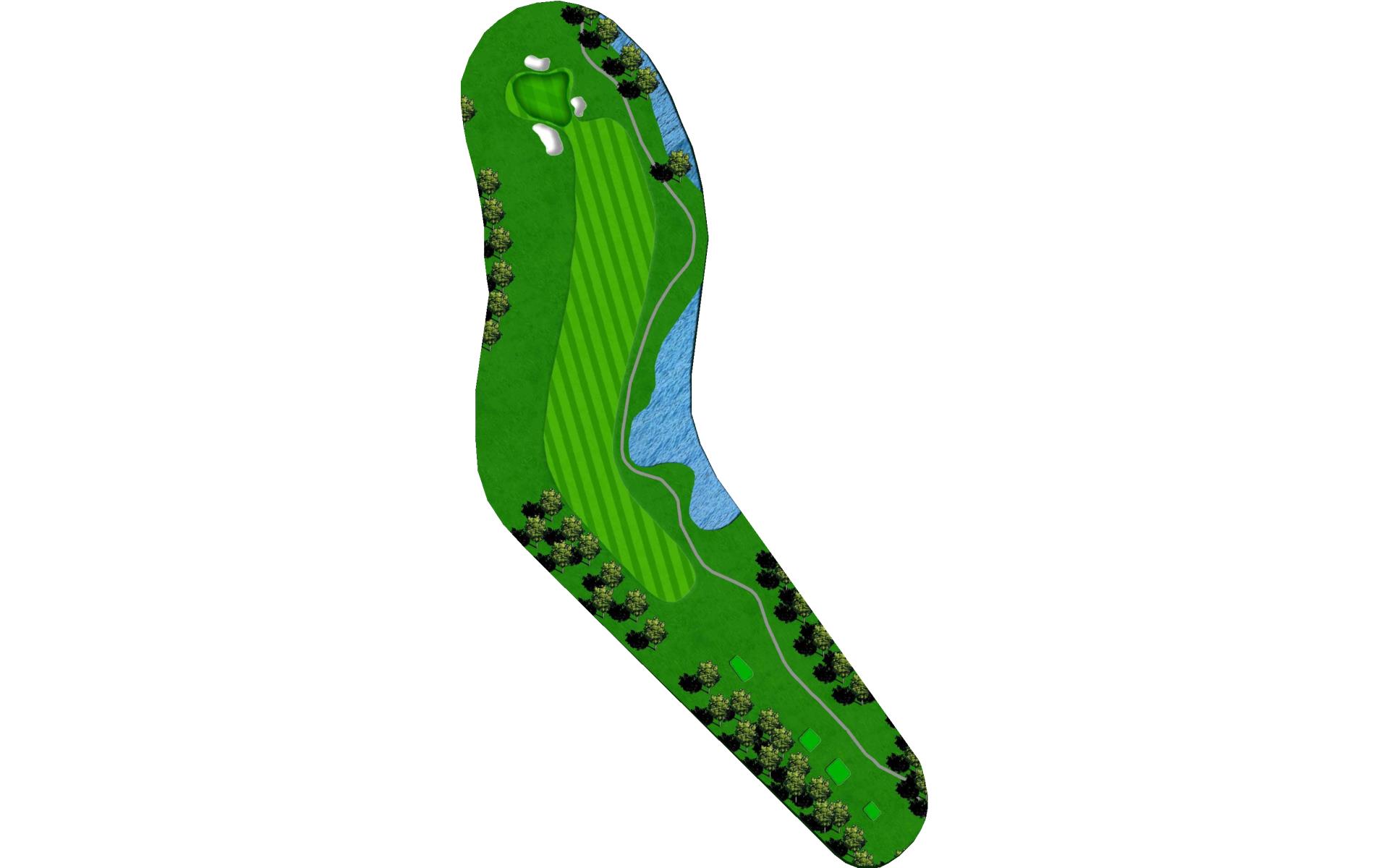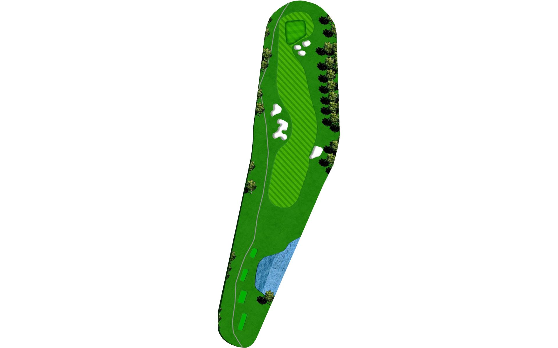A classic risk-reward dog leg left par 4 where the longer hitters can take their tee shot over the lake leaving a small wedge into a green guarded by bunkers left, right and over the back right behind the putting surface. Should one choose not to take on the lake, a tee shot up the right side of the fairway will leave the player with the most ideal shot into this green. Pampas grass helps show the right edge of the lake. Beware as the fairway slopes to the left toward the lake.