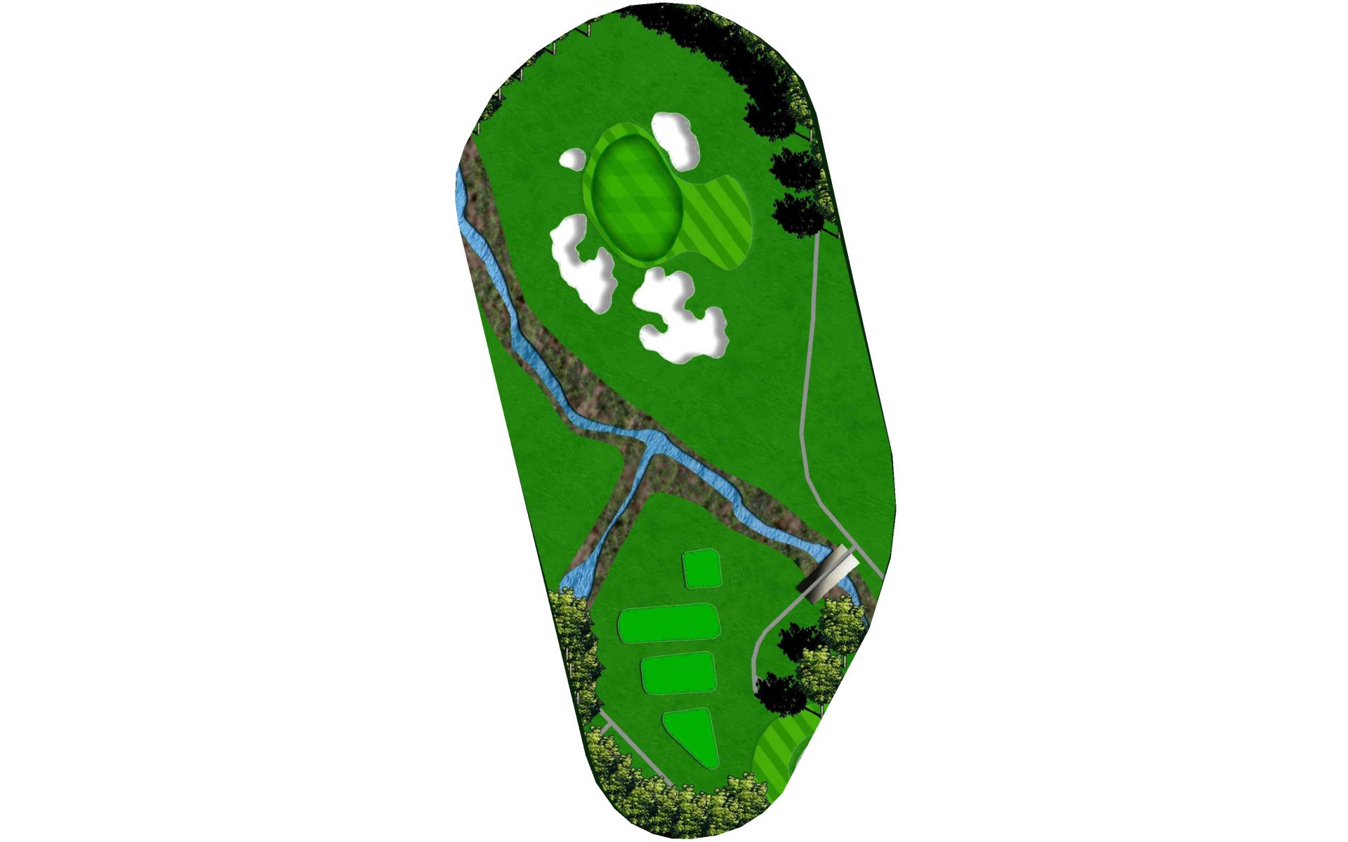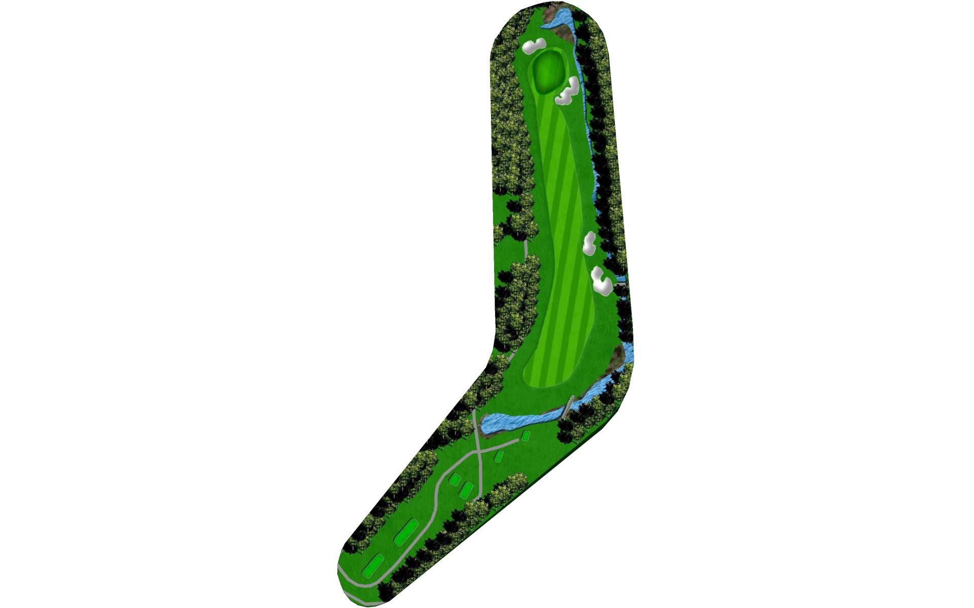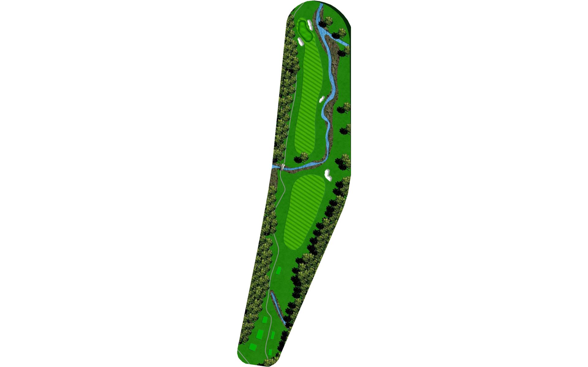 A straightaway par 5 with a creek in middle of fairway, which narrows from there up to a green with an out of bounds left.