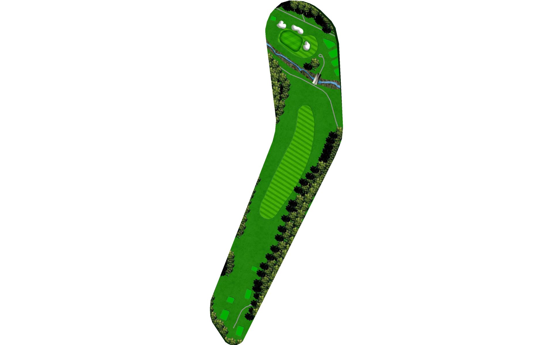 If you cut off enough with your driver, you may have a mid-iron shot into green; otherwise, you'll have to lay up short of creek in front off the green and play a three-shot hole.