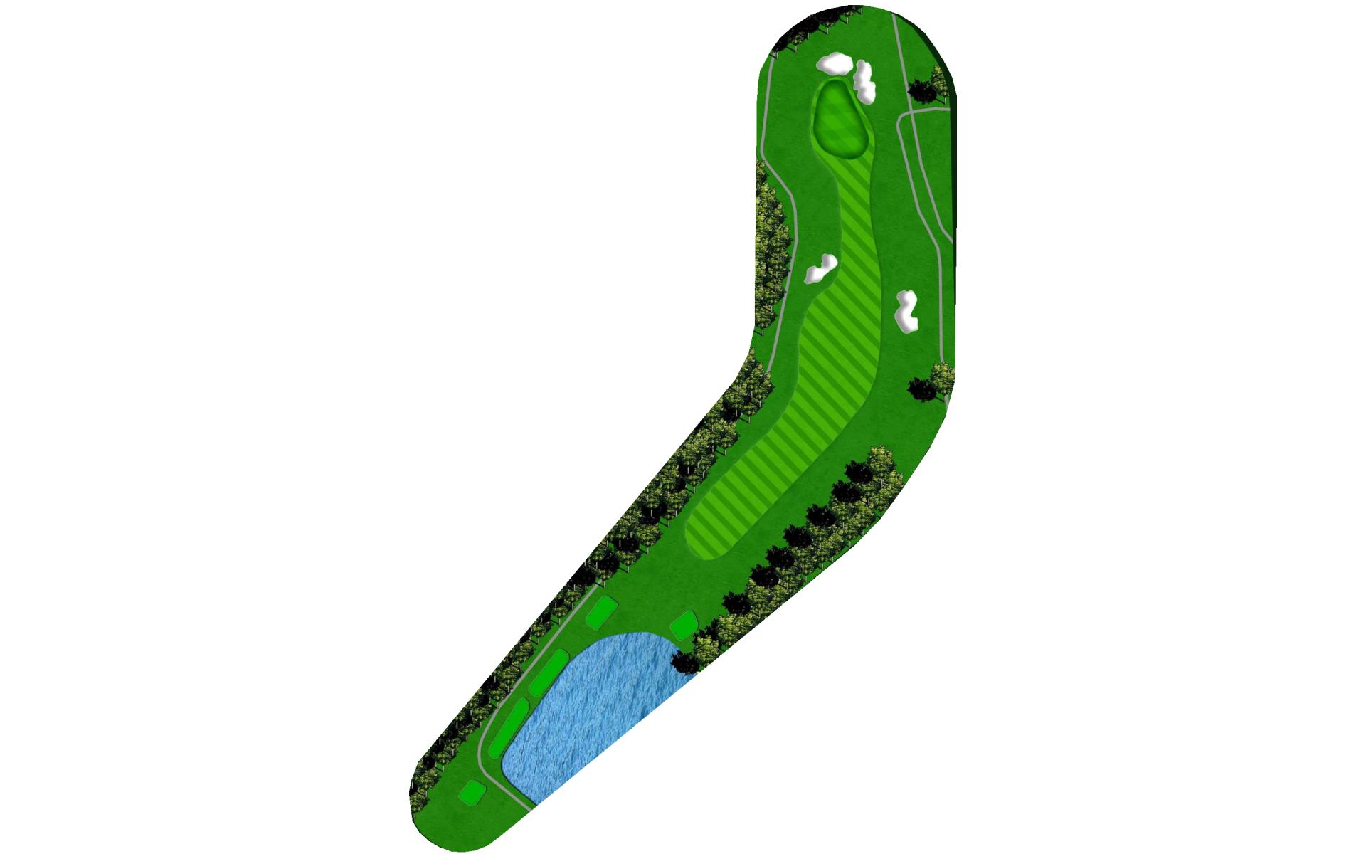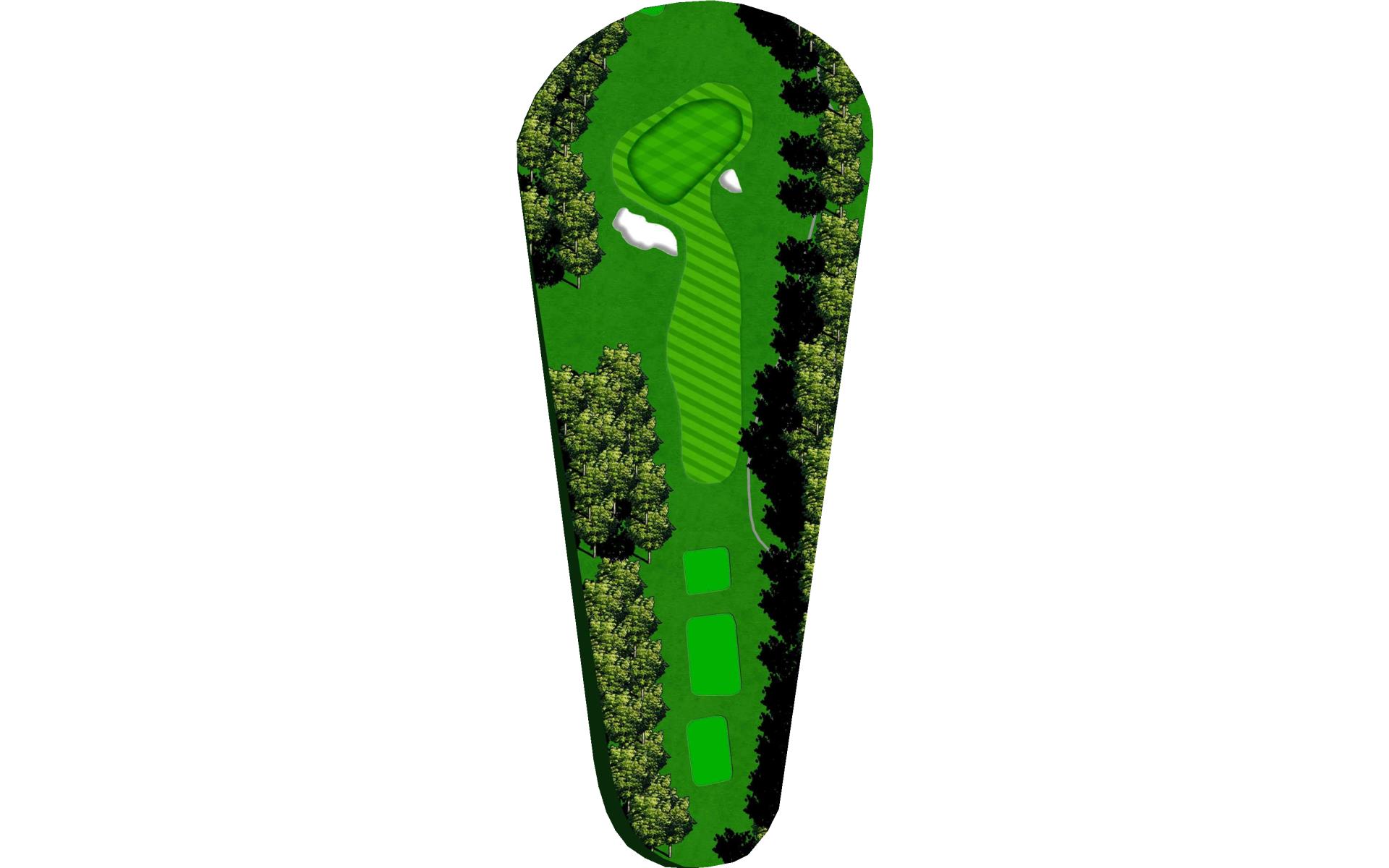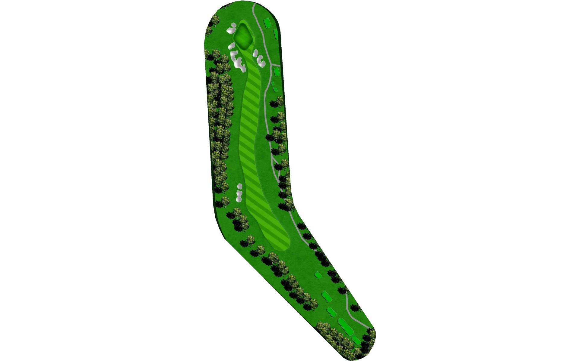A straight dogleg left with an uphill elevated green that's surrounded by bunkers.