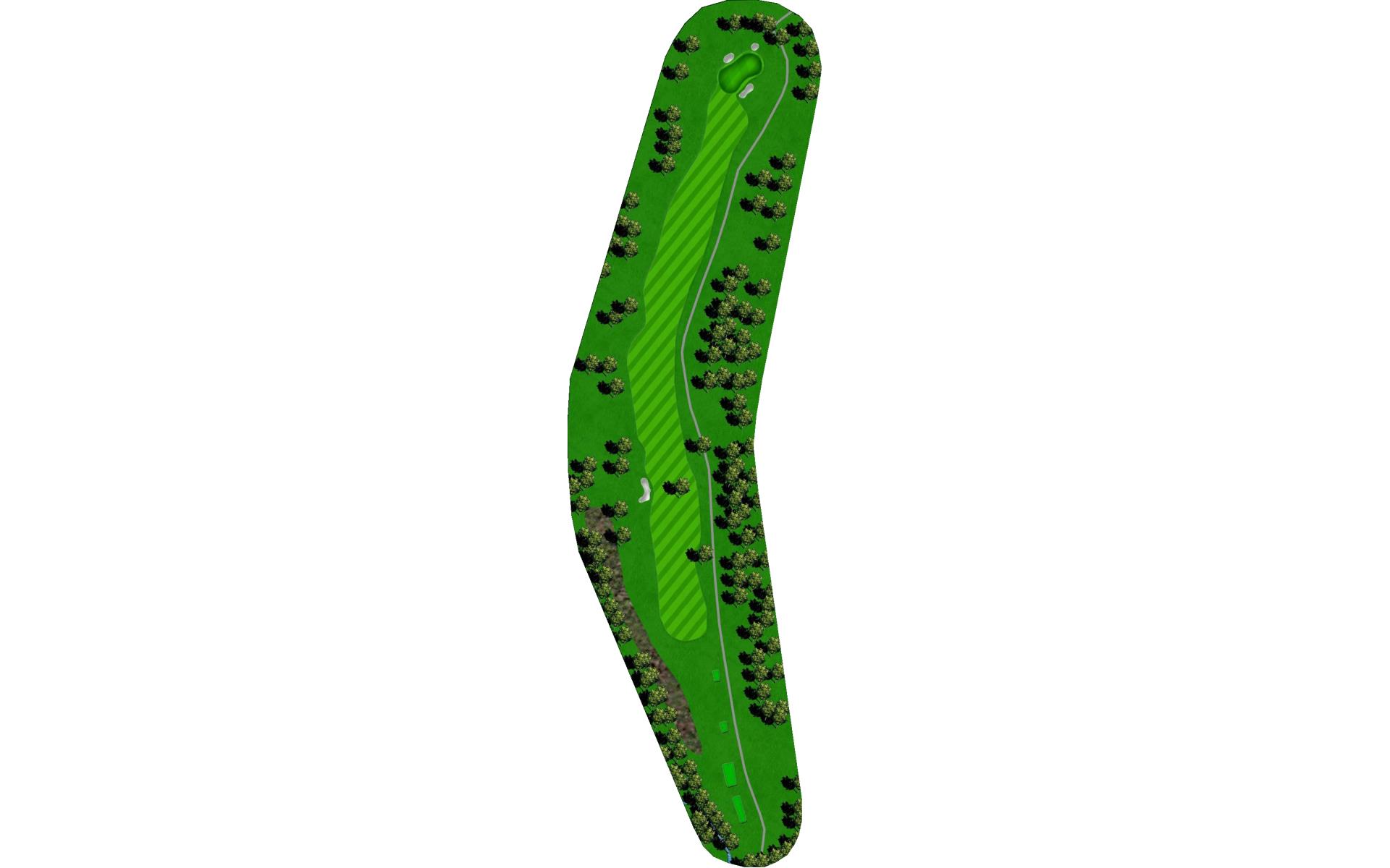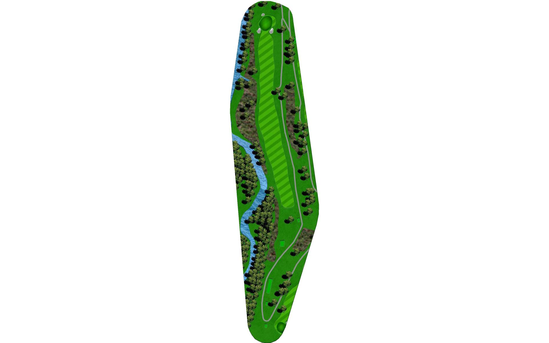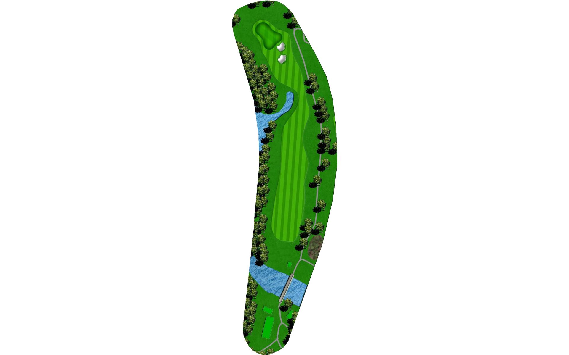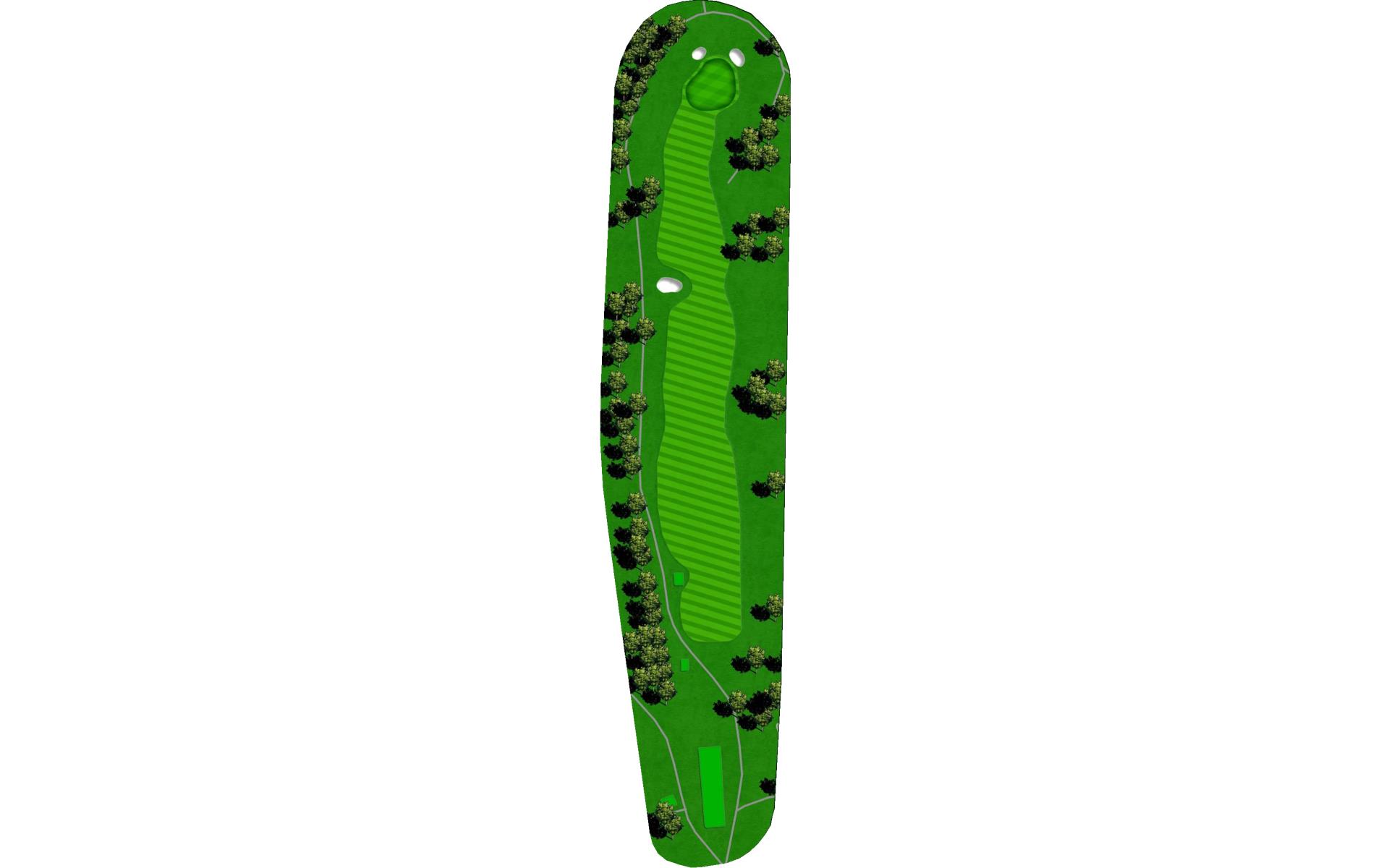 A creek runs along the left side from tee to green, and there is a pond hidden behind the bank of trees on the right. Long hitters can reach the pond off the tee. Those that hit the fairway have an easy approach to an unguarded green.