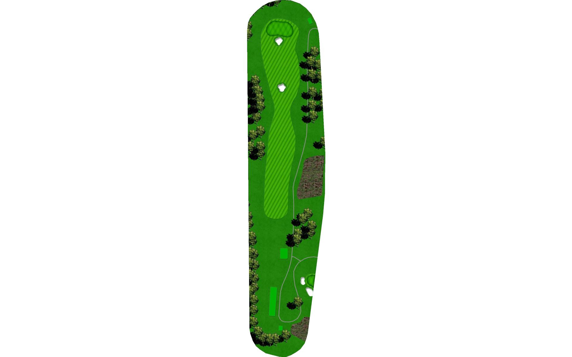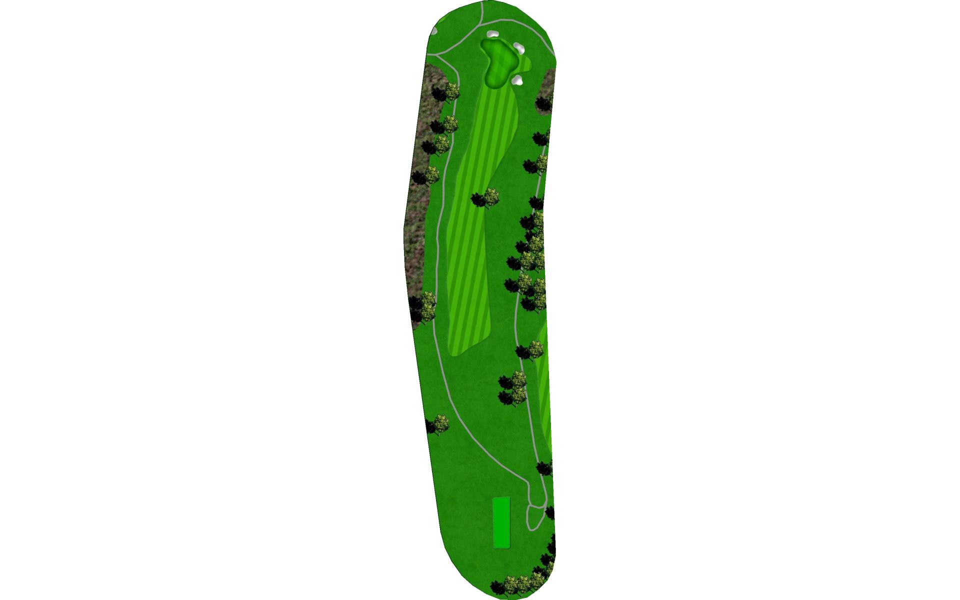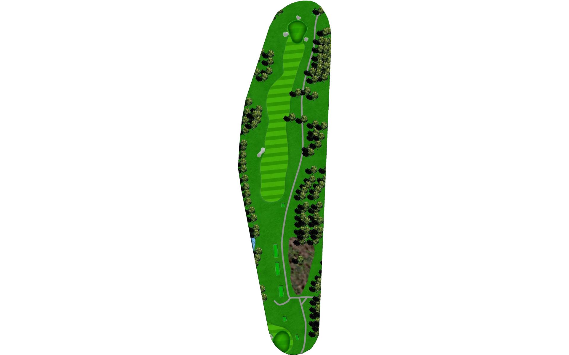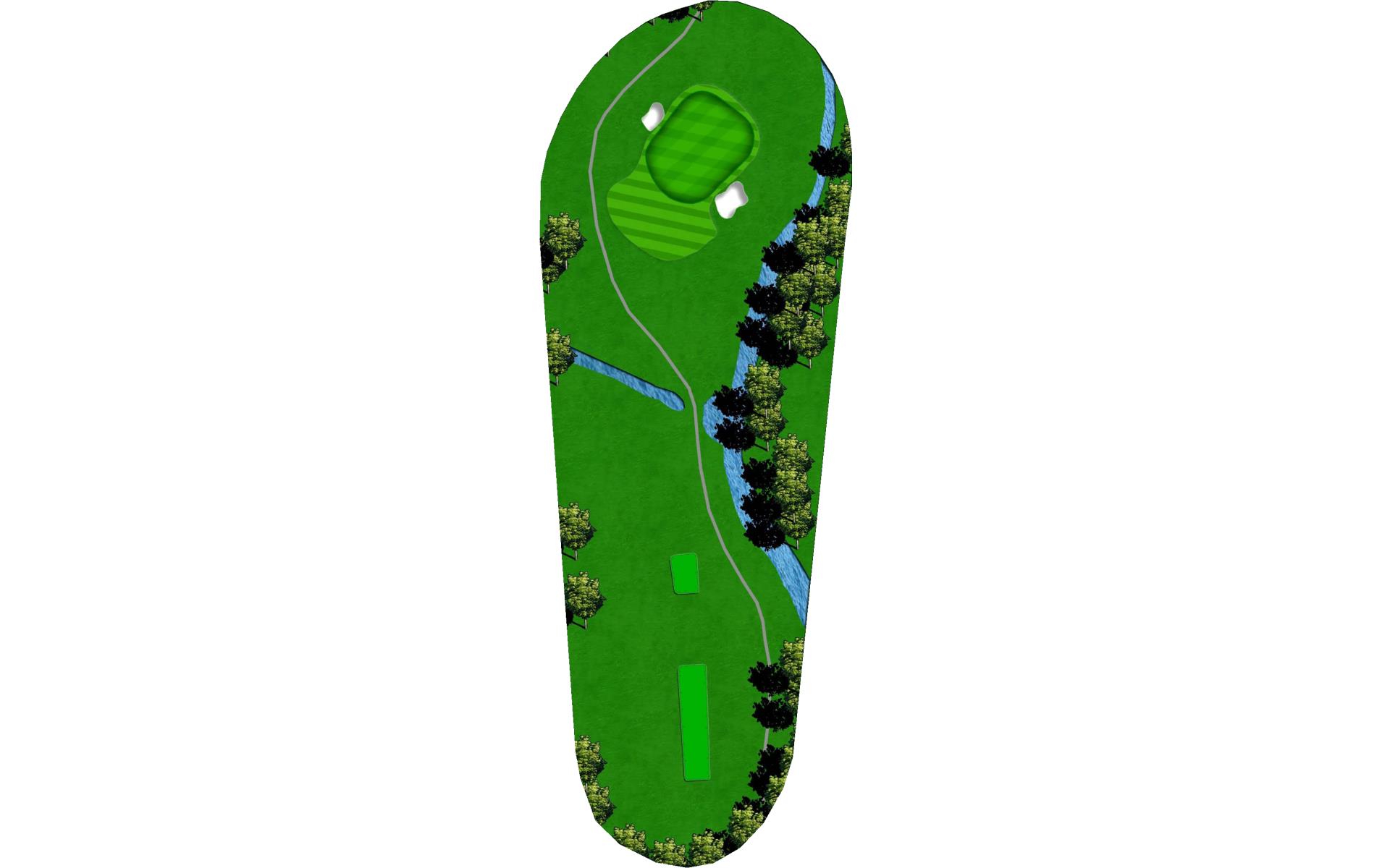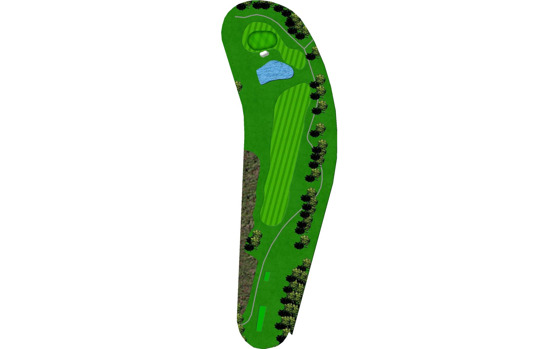 A creek runs along the left side from tee to green, and there is a pond hidden behind the bank of trees on the right. Long hitters can reach the pond off the tee. Those that hit the fairway have an easy approach to an unguarded green.