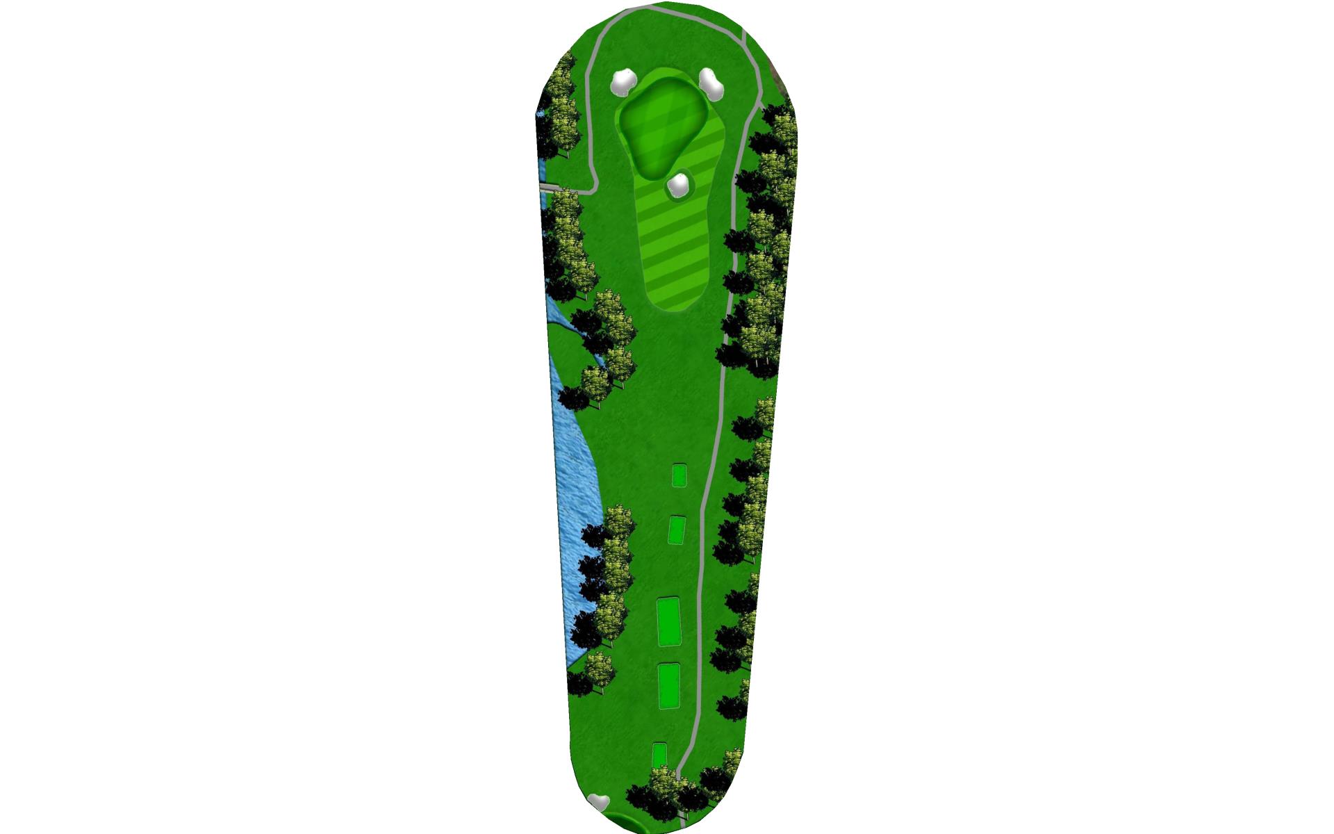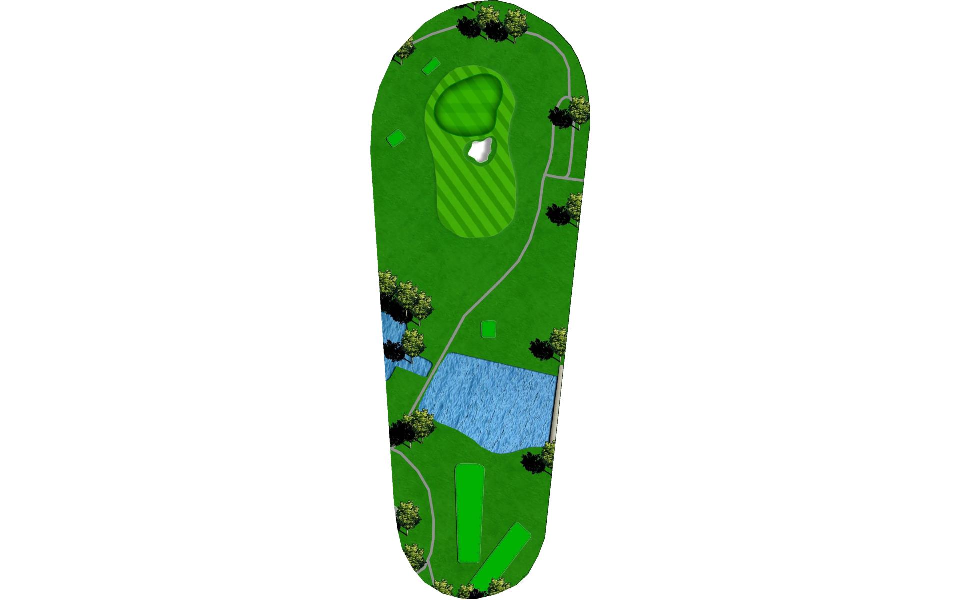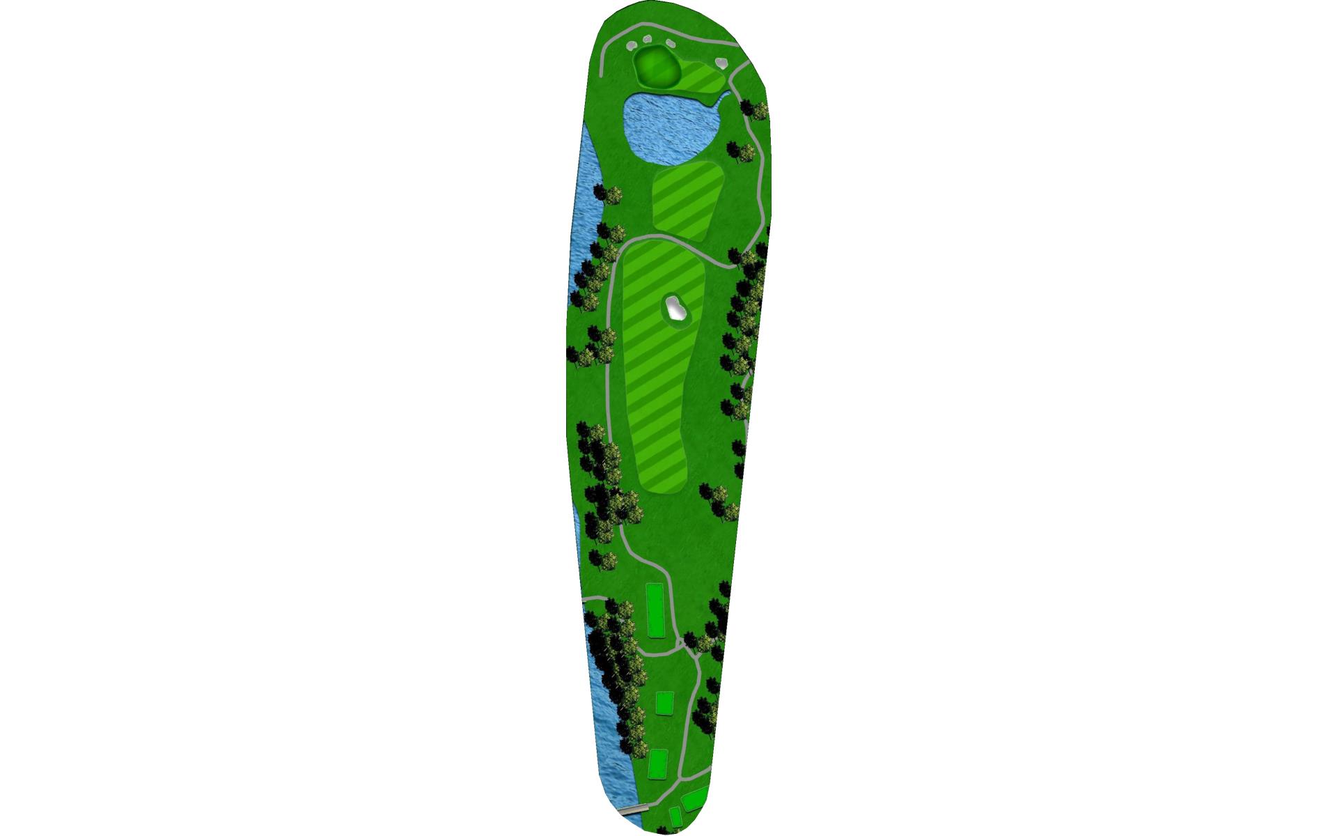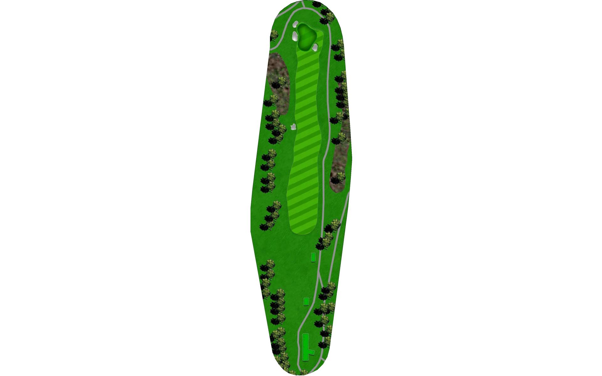A creek runs along the left side from tee to green, and there is a pond hidden behind the bank of trees on the right. Long hitters can reach the pond off the tee. Those that hit the fairway have an easy approach to an unguarded green.