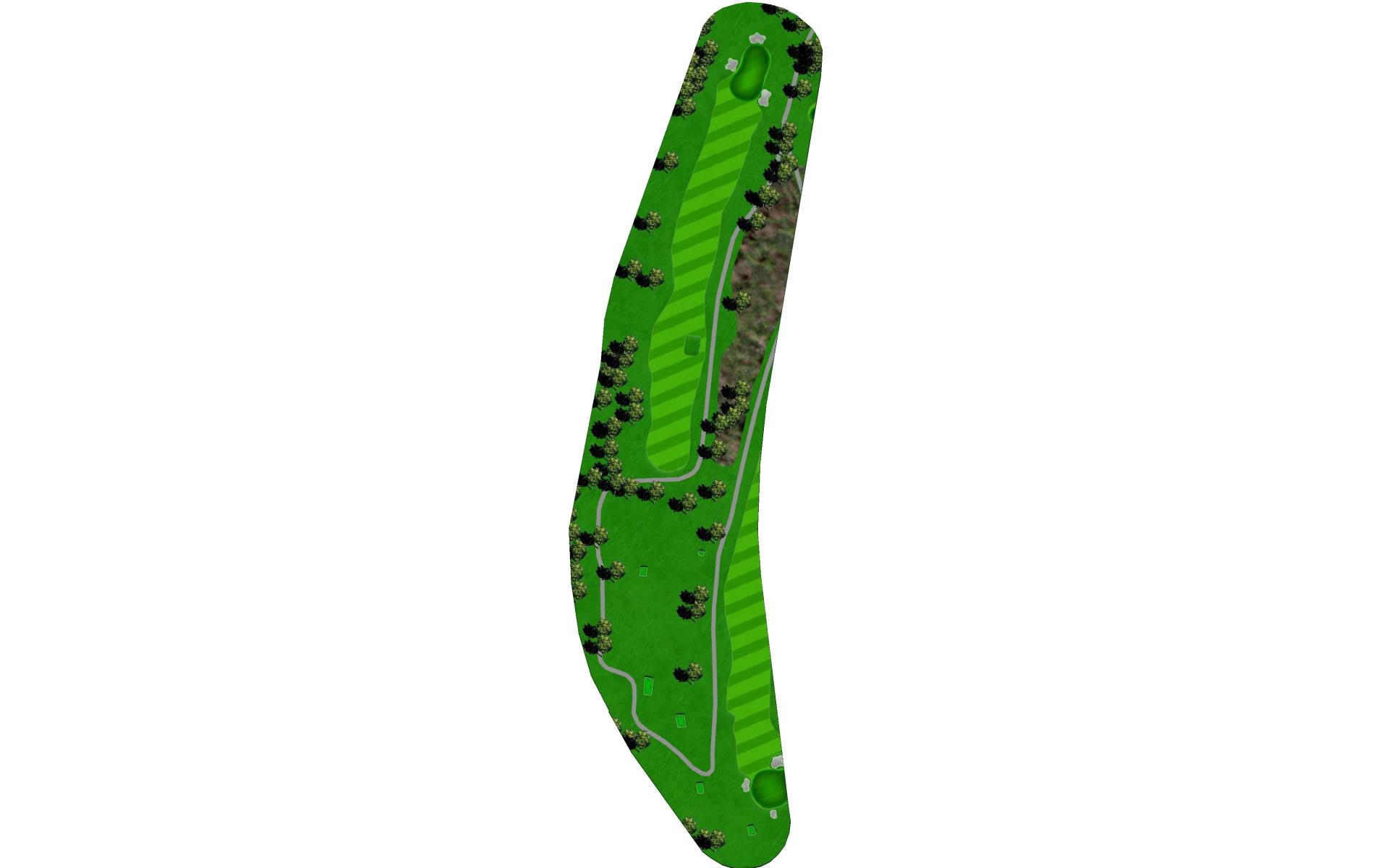 A dogleg left par 4 with OB up the left side from tee to green. The green has a ridge that cuts it in half, and slopes from left to right.