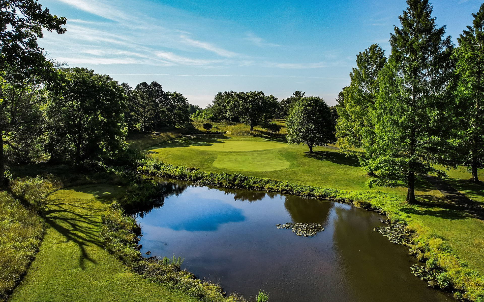 Chantilly National's golf course, designed by Washington, DC native Ed Ault, effortlessly combines challenge and natural splendor, appealing to golfers of all skill levels. Ault's classic design harmoniously integrates rolling fairways, mature trees, and water hazards, resulting in a visually captivating and strategically demanding experience. Each hole showcases a distinct personality, highlighting Ault's proficiency in strategic shot-making. Noteworthy features encompass the signature par 3 on Hole 12, set over Lake Chantilly's spillway, and the marsh-lined par 4 finishing hole, where an audience on the patio enhances the excitement.