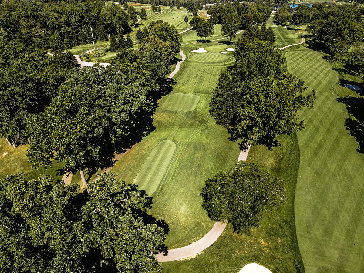 This uphill Par 4 plays just under 400 yards from the Member tee box. Three fairway bunkers guard the landing area. The ideal target line is the right edge of the left bunker. The approach shot is uphill into a tiered green. It is important to know where the pin is to not be above the hole.