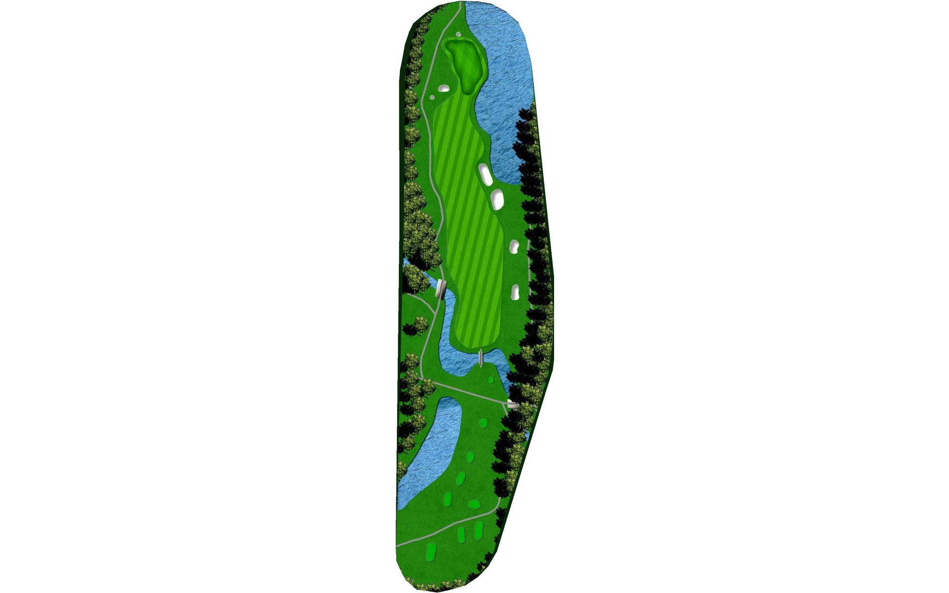 The tee shot needs to be on the left to avoid the water, aiming for the Hilliard Water Tower. All kinds of trouble in all kinds of places present many different strategies. All in all, the green is large and severe. Any two putt is good here.