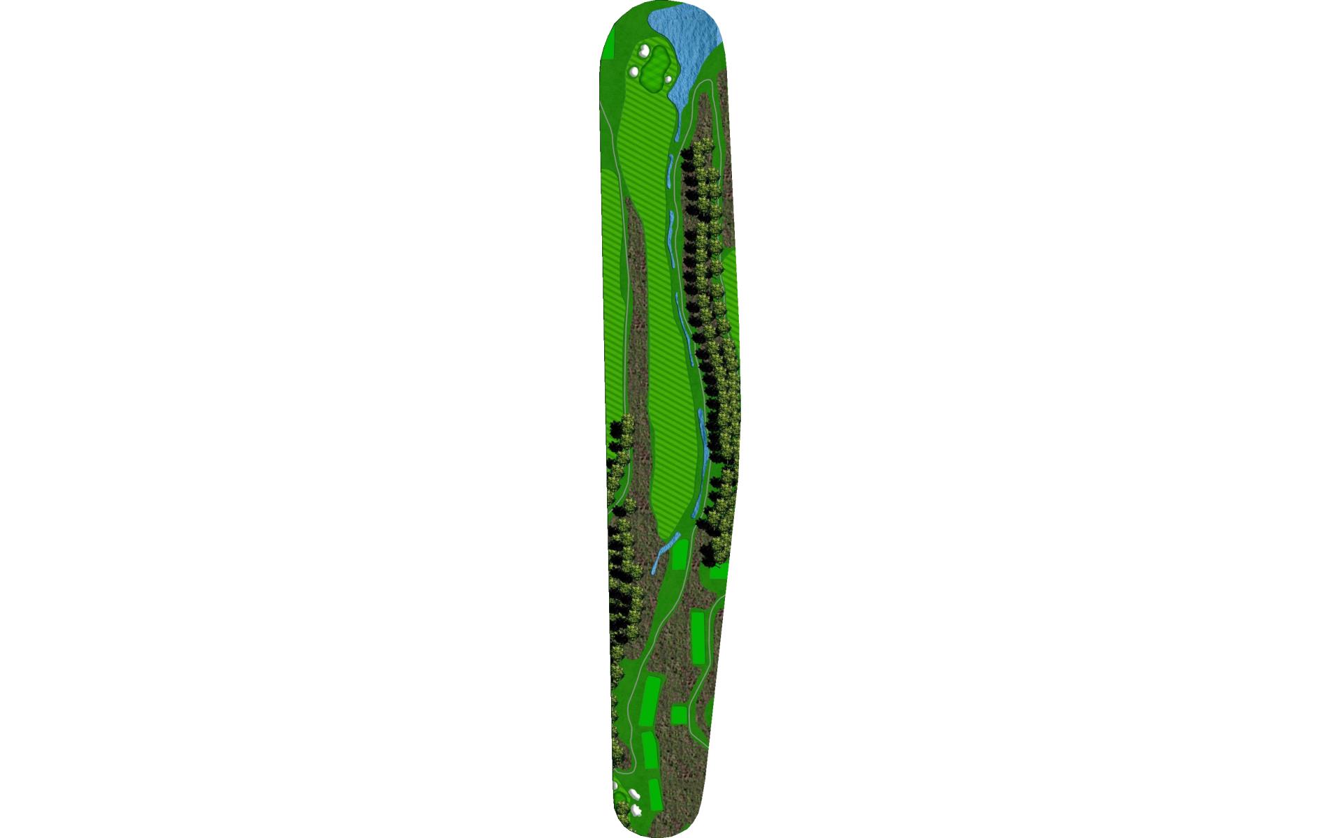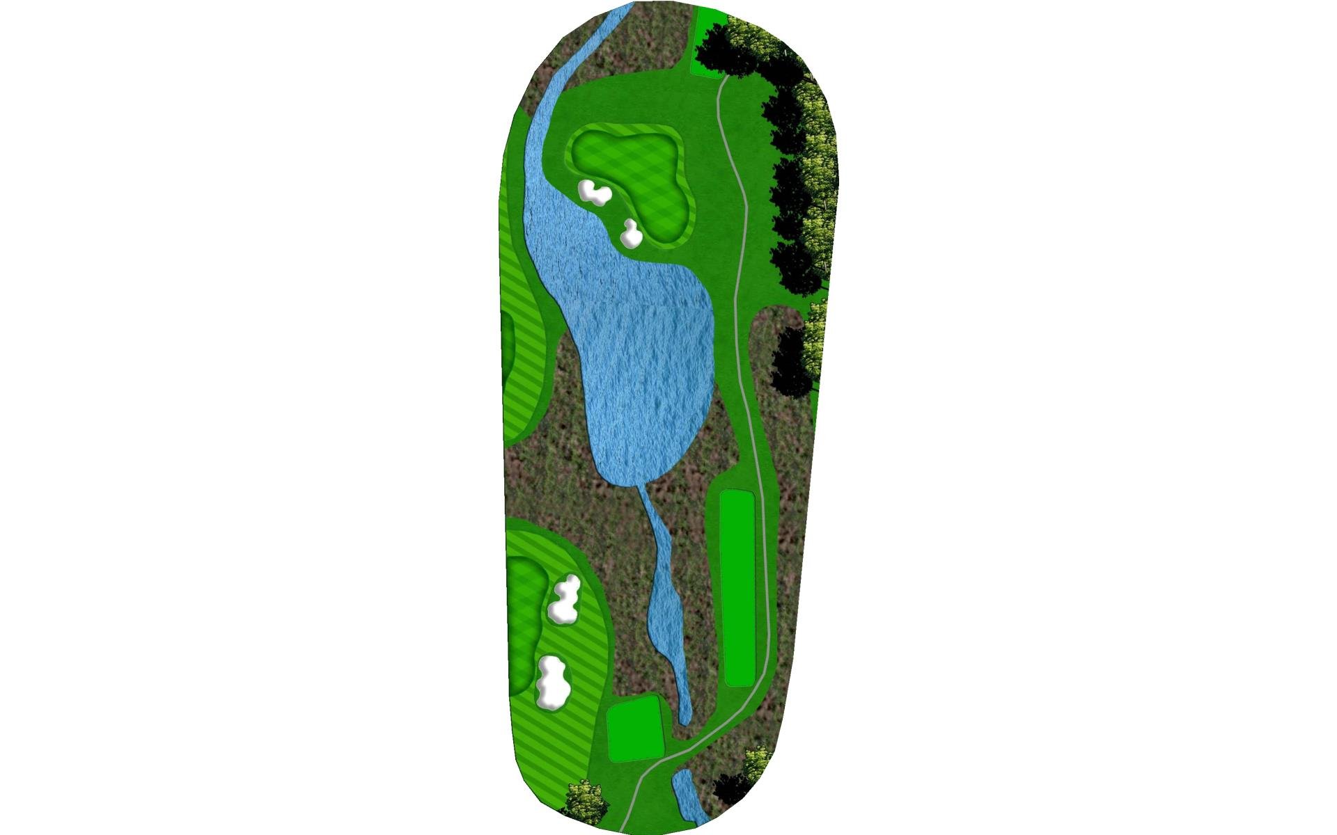 Tee shot through a narrow shoot. Golf balls hit on the left side of the fairway typically will bounce right. The green is narrow and protected by water on the front and a bunker all along the back side.