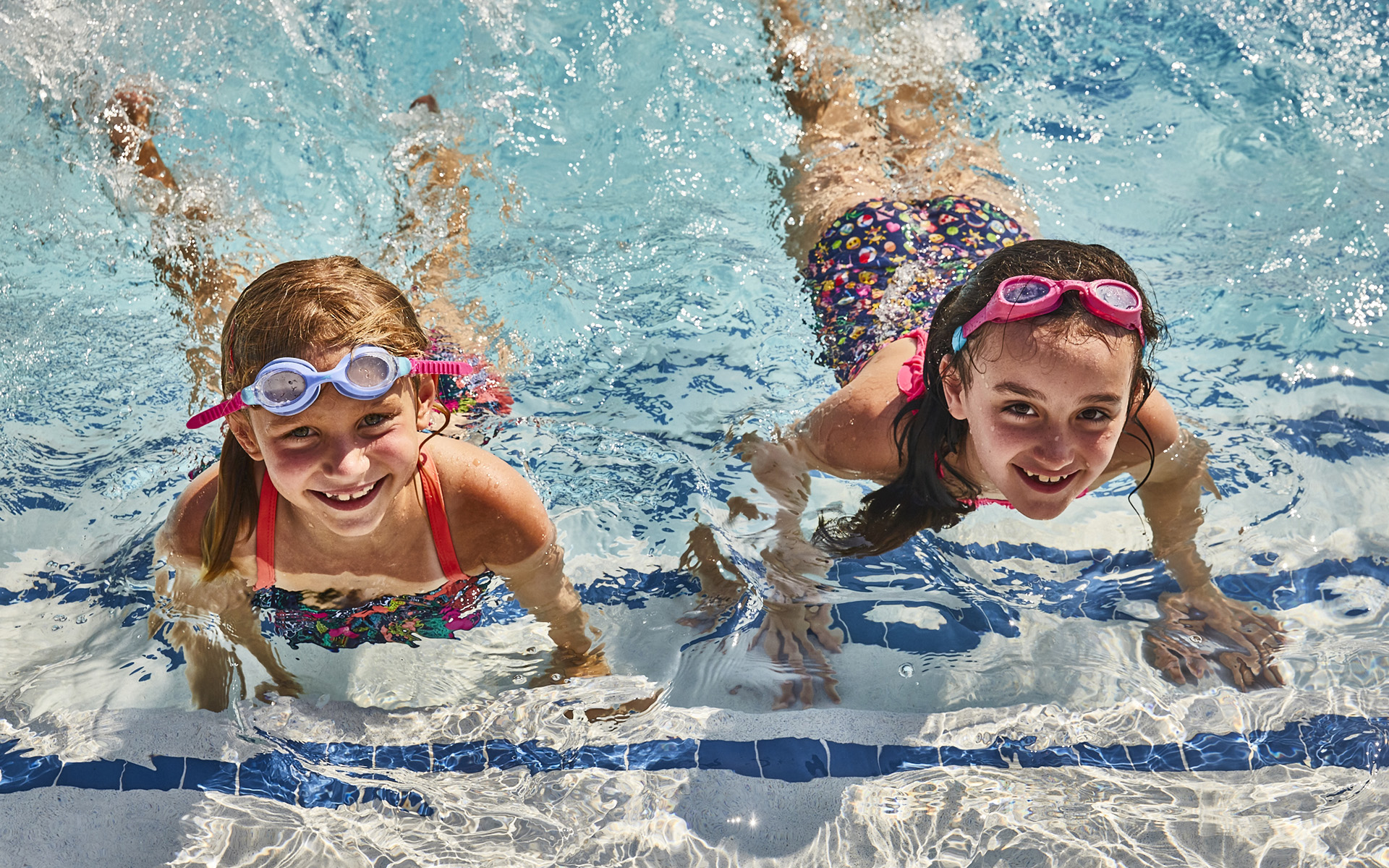 A large deck, fun slides, and a kids' splash pad make the pool complex the go-to destination during summertime.