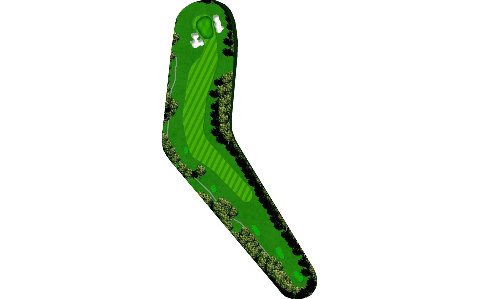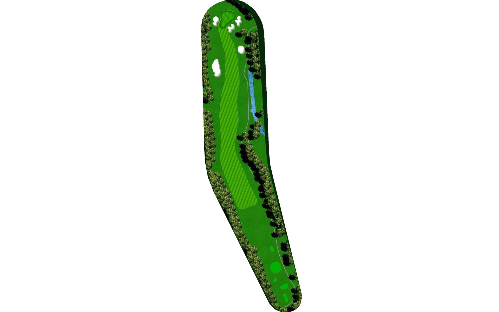 A dogleg right par 4. A tee shot to the corner will give you a mid iron into the green. If you cut the ball you can get it around the corner and have a wedge in your hand. The green is guarded on three sides by bunkers and slopes from back to front.