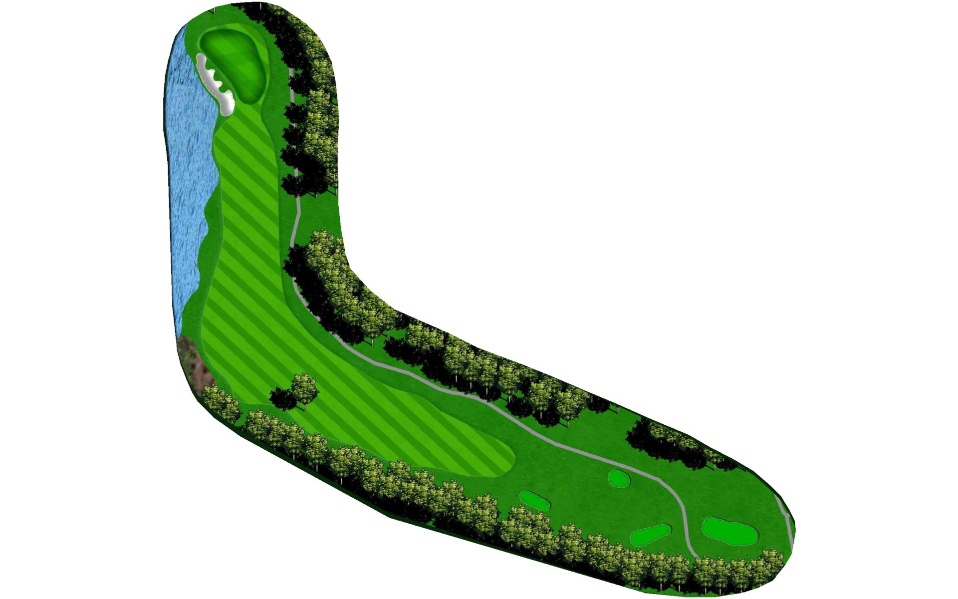 The finishing hole is a par 5 that requires players to hit the fairway if they want to go for the green in two. Rolling terrain slopes towards the water down the right side of the hole. This green is surrounded on three sides by water and the fourth by a bunker.