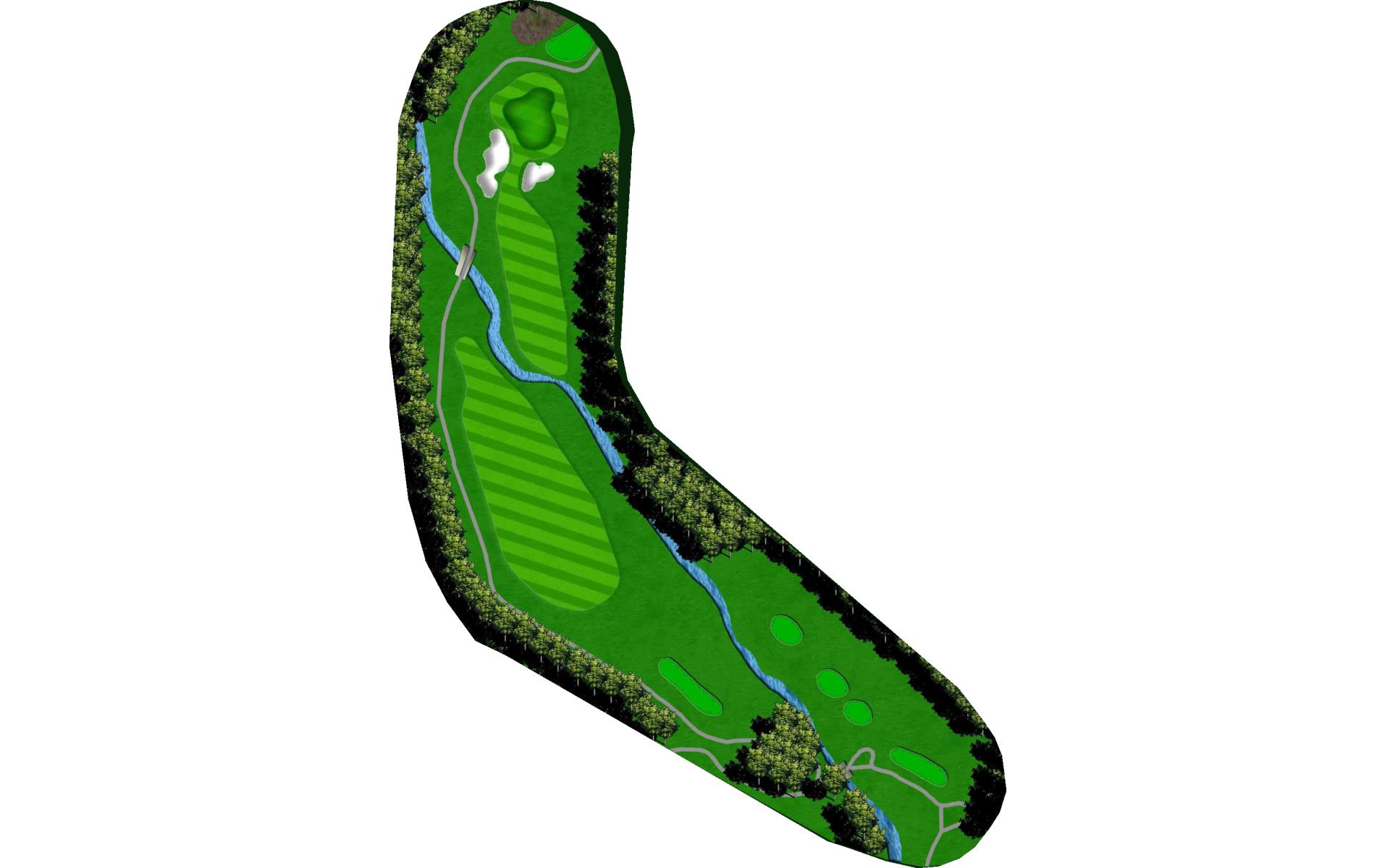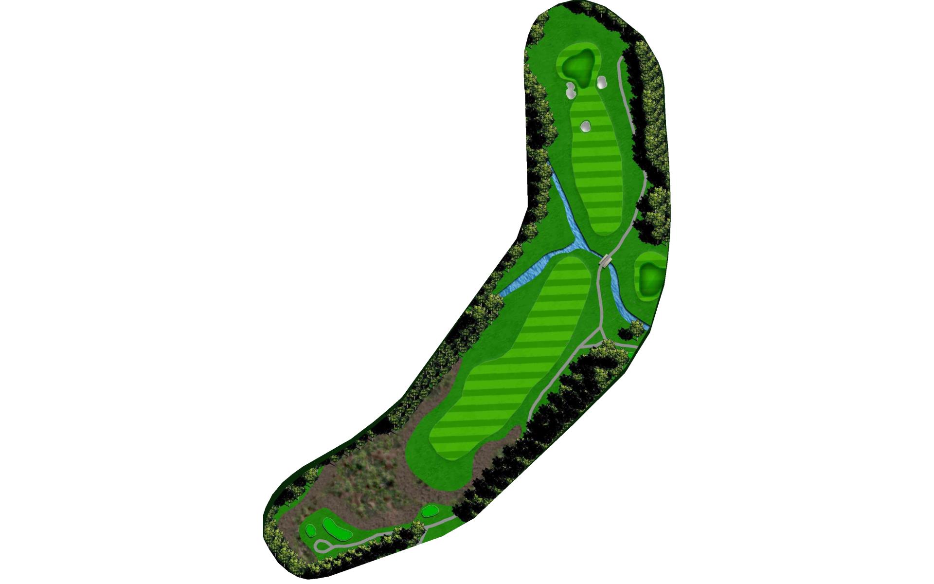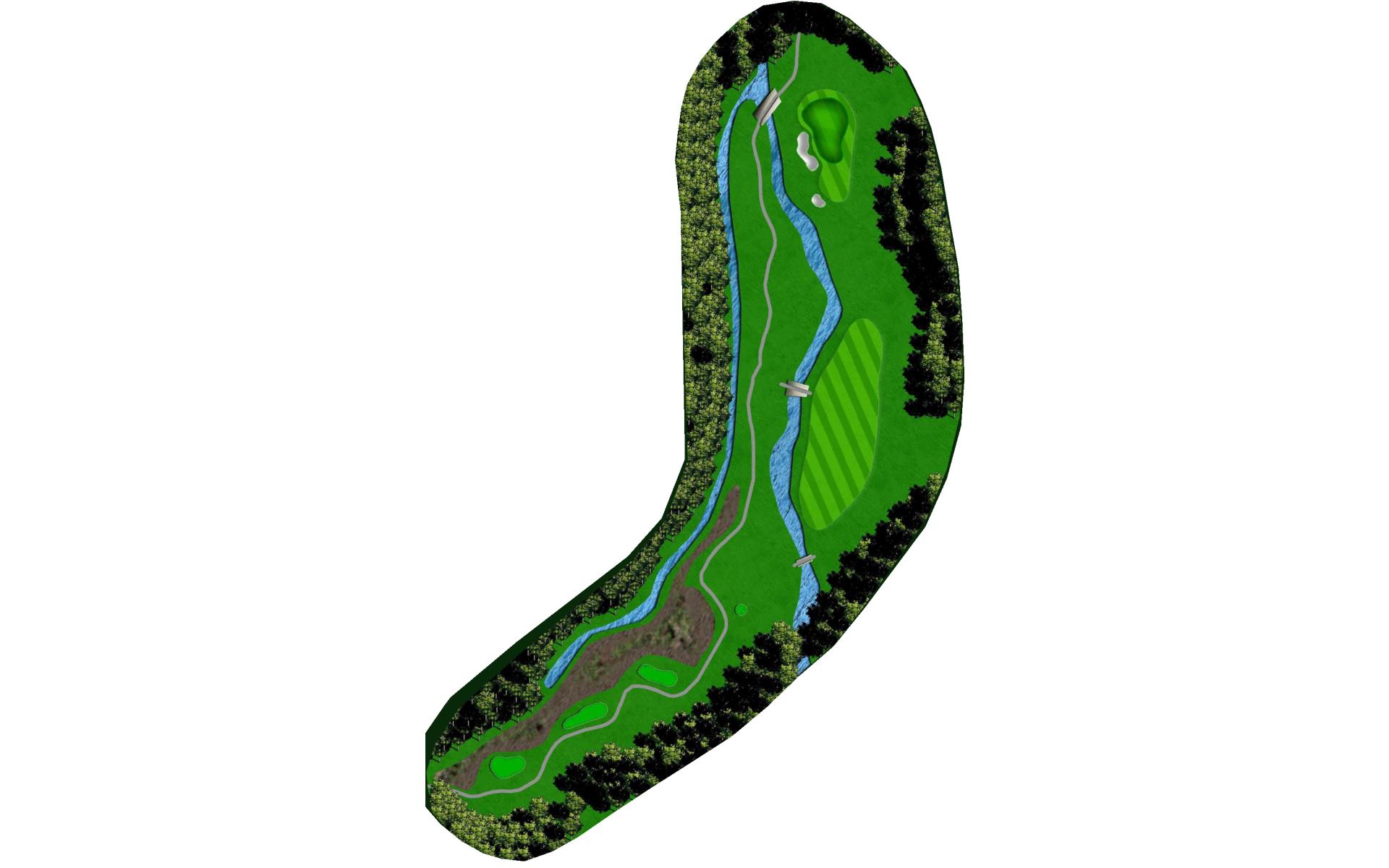 Dogleg left Par 4 that flows with a creek that runs up the middle of the hole. Play your drive with a driver or fairway wood out to the 150 stone. Favor the right side of the green as your approaches will bounce left. This is a good 3 club green so pay attention to the where the pin is for your best chance to par the hole.
